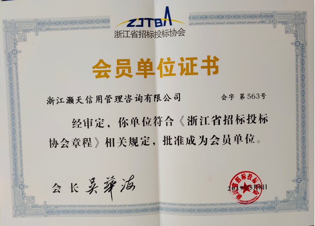 為了更好了解企業(yè),更好的為招投標企業(yè)在信用報告,信用管理,信用咨詢等方面的服務,也為了我司在信用行業(yè)更好的發(fā)展,很榮幸成為浙江省招標投協(xié)會中的一員。
